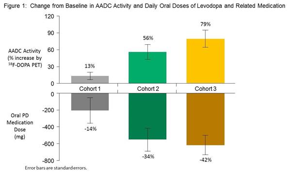 Brain imaging of these subjects at 6 months post surgery, indicates that VY-AADC01 treatment resulted in a 13% increase, a 56% increase, and a 79% increase in the average amount of AADC enzyme activity in the putamen across Cohorts 1, 2, and 3, respectively. And this increase in AADC activity was accompanied by a reduction of the daily doses of oral levodopa that were being taken across all three groups (an average reduction of 208 mg (14%), 553 mg (34%) and 618 mg (42%) for Cohorts 1, 2 and 3, respectively). This is impressive.