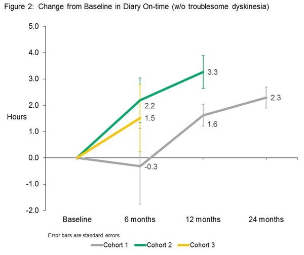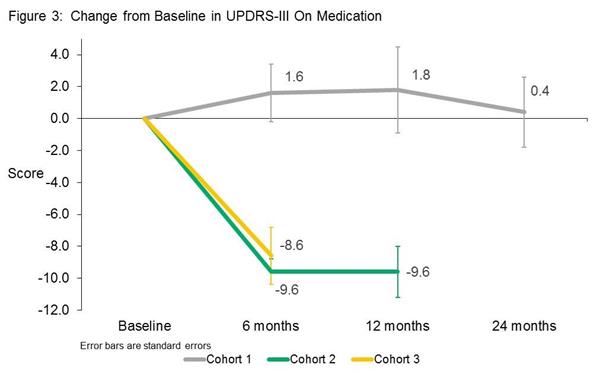 Note: The absence of 12 and 24 month data for cohort 2 & 3 is because the study is ongoing and that data has not yet been collected. Cohort 1 (on the lowest dose of VY-AADC01 were the first to start the study.