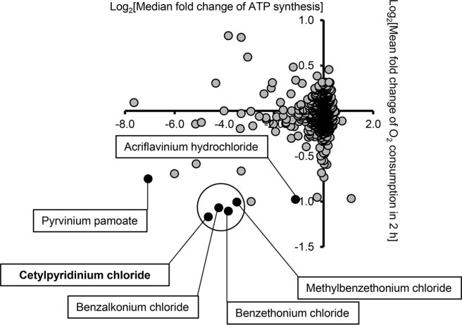 All of the black circles in the bottom left hand corner of the graph (indicating a poor score on both ATP synthesis and oxygen consumption) come from a family of chemicals called quaternary ammonium compounds (or QUATS).