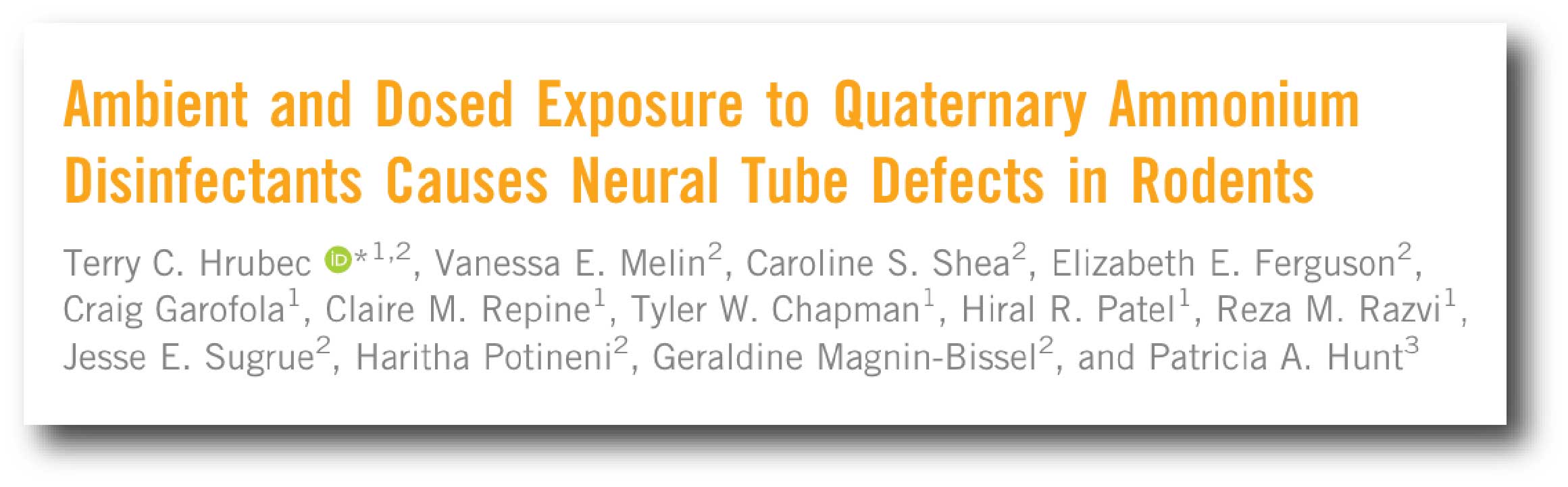 The researchers found an increased rate of neural tube defects in both rats and mice exposed to ADBAC+DDAC. The neural tube is the developmental structure that gives rise to the brain and spinal cord. Shockingly, the neural tube defects persisted for two generations after exposure to the QUATS was stopped, and male exposure alone was enough to cause the neural tube defects.
