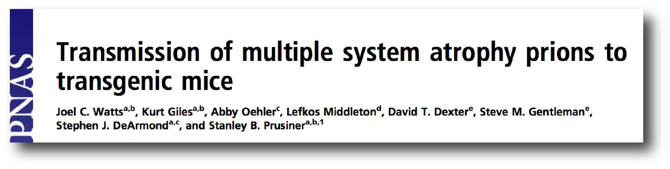 At approximately 100 days post injection, the single copy mice began to develop progressive signs of neurologic problems. The investigators concluded that their “results provide compelling evidence that alpha synuclein aggregates formed in the brains of MSA patients are transmissible and, as such, are prions”.