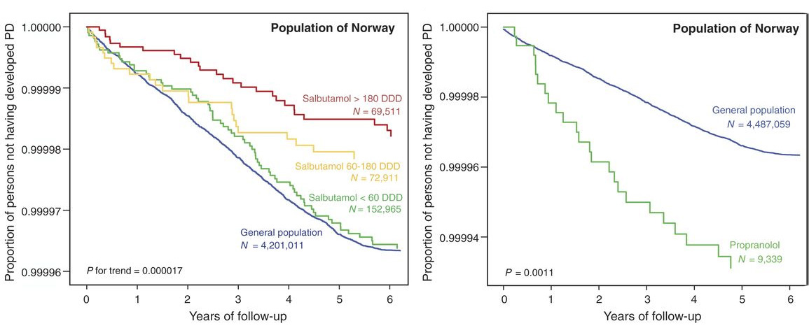 The researchers also reported that the drug, Propranolol which blocks the Beta2-Adrenergic receptor was associated with a two-fold increase in the risk of developing Parkinson’s disease (see graph below):