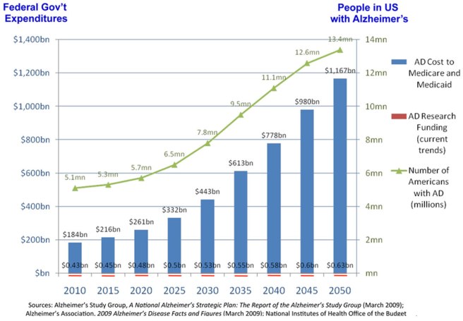 The projected cost of dementia (note the tiny red bars). Source: UCSF