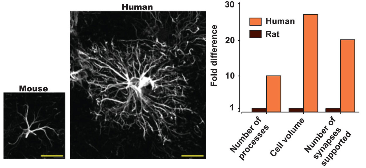 And when you compare human astrocytes with their mouse/rat counterparts, you will note that human astrocytes are dramatically different. Human astrocytes are vastly bigger (in volume), they have many more branches (or processes), and they support 20 times as many synapses (the point on a neuron where a signal is transmitted):