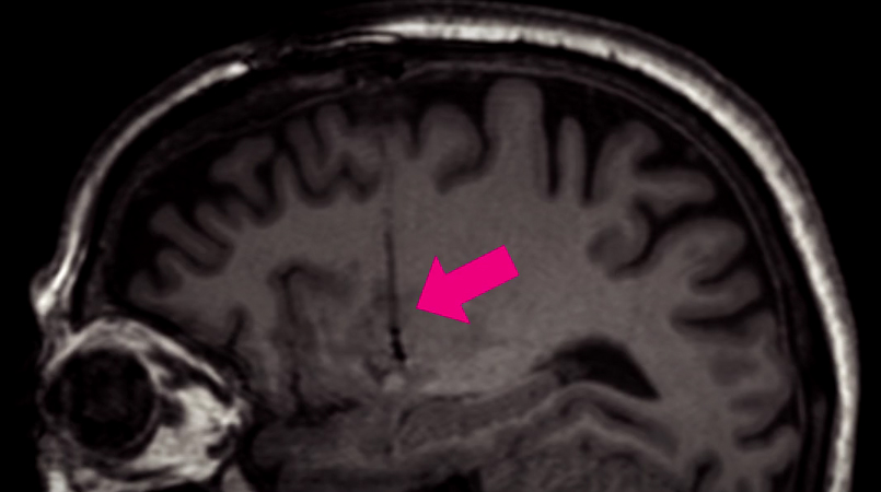Targeting the putamen (pink arrow indicates the syringe tract). Source: LCT