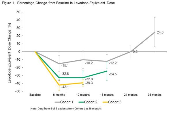 During the study, the participants were instructed to reduce their daily doses of L-dopa (and related medications), resulting in reductions of 15%, 33% and 42% for Cohorts #1, #2 and #3, respectively, at six months post treatment with VY-AADC. As you can see in the figure below, these reductions in medication were sustained for Cohorts #1 until 18 months, at which point those individuals who received the lowest dose of VY-AADC began to require more L-dopa medication: