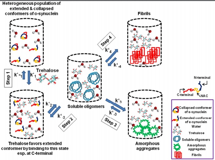 - Trehalose, an osmolyte, has previously been shown to inhibit Parkinson’s-associated α-Synuclein aggregation. New research suggests that trehalose modulates the transitions of α-synuclein; speeds up onset of aggregation, but reduces fibril load (Click here to read the abstract of this research).