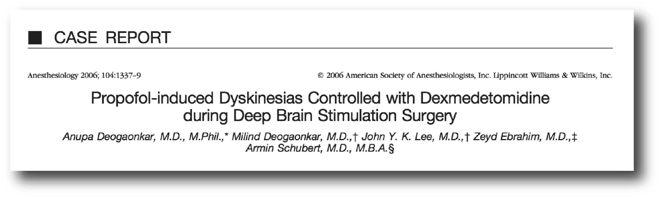 Title: Propofol-induced dyskinesias controlled with dexmedetomidine during deep brain stimulation surgery.