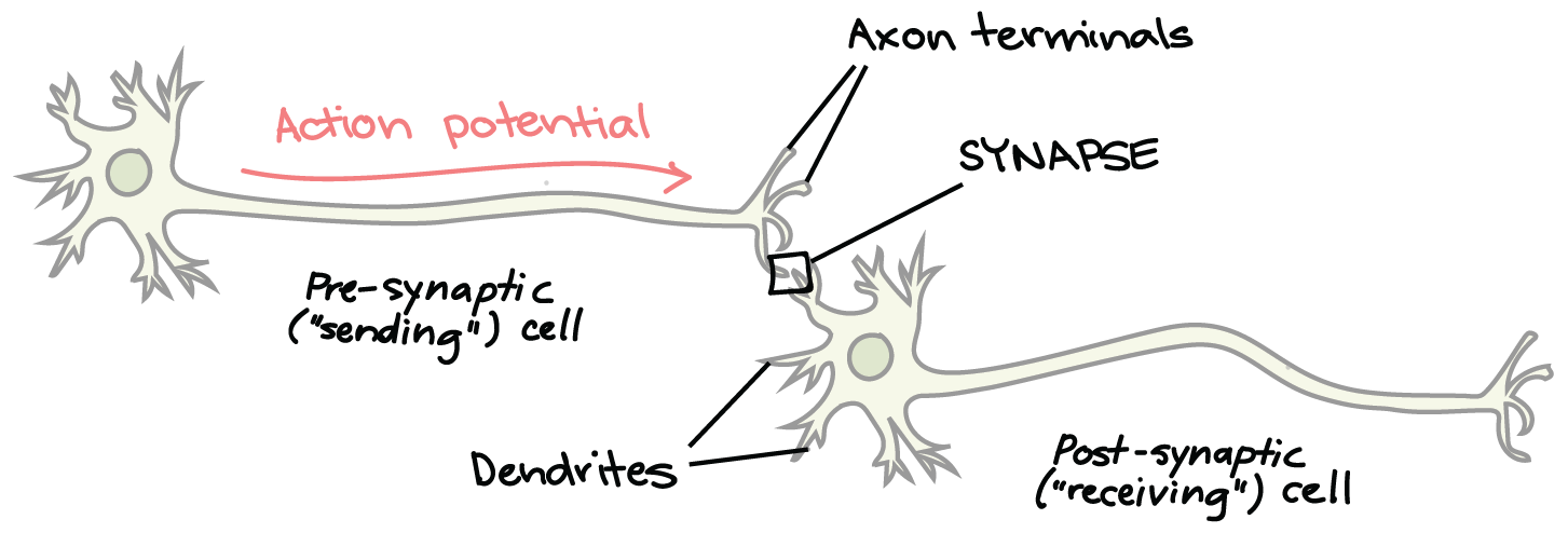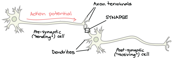 The synapse (in CAPITALS) between two neurons. Source: Khanacademy