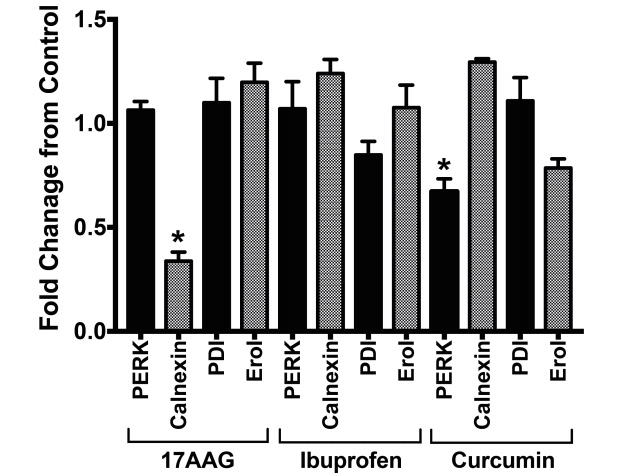 They found that both ibuprofen and curcumin were able to significantly reduce the ER stress and UPR activation by isoflurane. In the graph below you can see the change in various ER stress and UPR-associated proteins (compared to untreated isoflurane exposed cells). 17AAG – also called Tanespimycin – is a derivative of an antibiotic. It was also investigated in this study, and had the same effect as ibuprofen and curcumin.