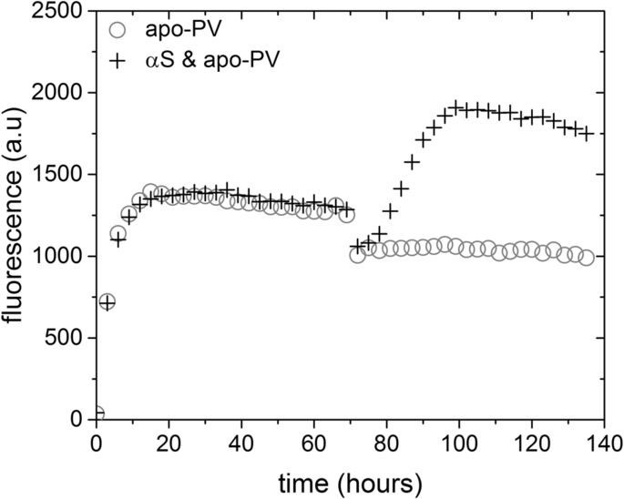 Importantly, the addition of calcium and the loss of β-parvalbumin amyloid structures resulted in the increase of alpha synuclein amyloid aggregates. As you can see in the image below, when β-parvalbumin and alpha synuclein were maintained in a low calcium solution they did not aggregate much over time. But as soon as the investigators added calcium to the solution (at 70 hours), there was an increase in alpha aggregation (the upward curve in crosses).