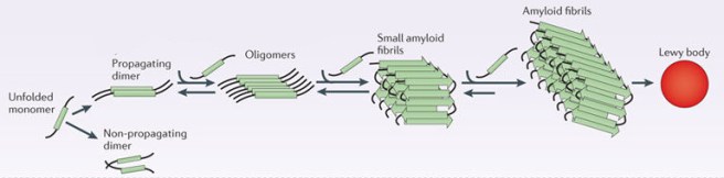 In Parkinson’s, we see this property in the “bad guy” protein, alpha synuclein. It has this ability to form amyloid states, which results in the production of fibrils and (subsequently) the formation of Lewy bodies (the characteristic circular clumps of alpha synuclein that appear in cells in the Parkinsonian brain):
