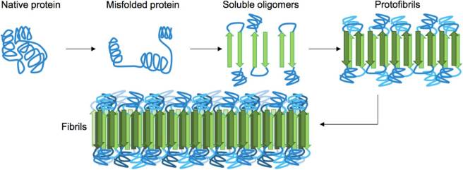 If you want to read more about amyloid state proteins (particularly in the context of disease), click here for a good review. And please don’t assume that amyloid clustering of proteins is only a disease-related phenomenon. There is a lot of evidence now of these amyloid-clusters of proteins having functional roles (Click here to read more about this).