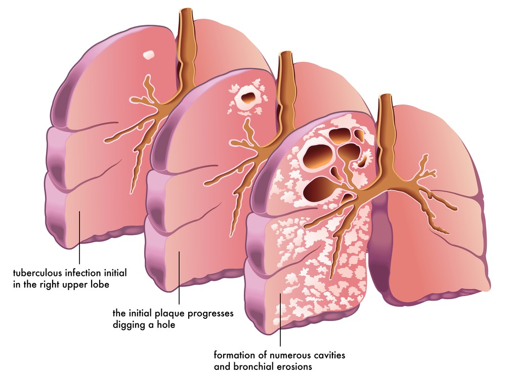 The active disease involves small cavities (or tubercles) developing in the lungs over time. Left untreated, this condition is progressive and fatal.
