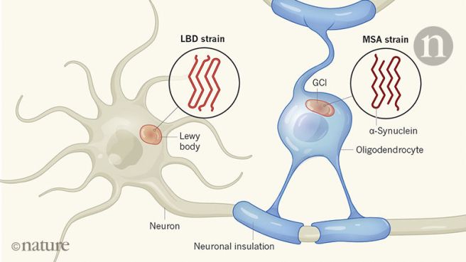 The Parkinson’s-associated alpha synuclein clusters (or aggregates) in glial cells are conformationally & biologically distinct from the Lewy bodies found in neurons. Different strains of alpha synuclein protein are determined by both misfolded seeds AND intracellular environments (Click here to read more and click here to read the press release).