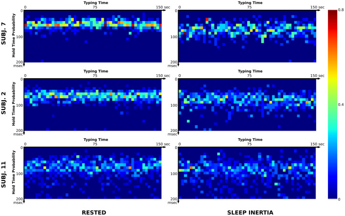 Examples of Key Hold Time in rested subjects (left) vs sleep inertia (right) for 3 participants