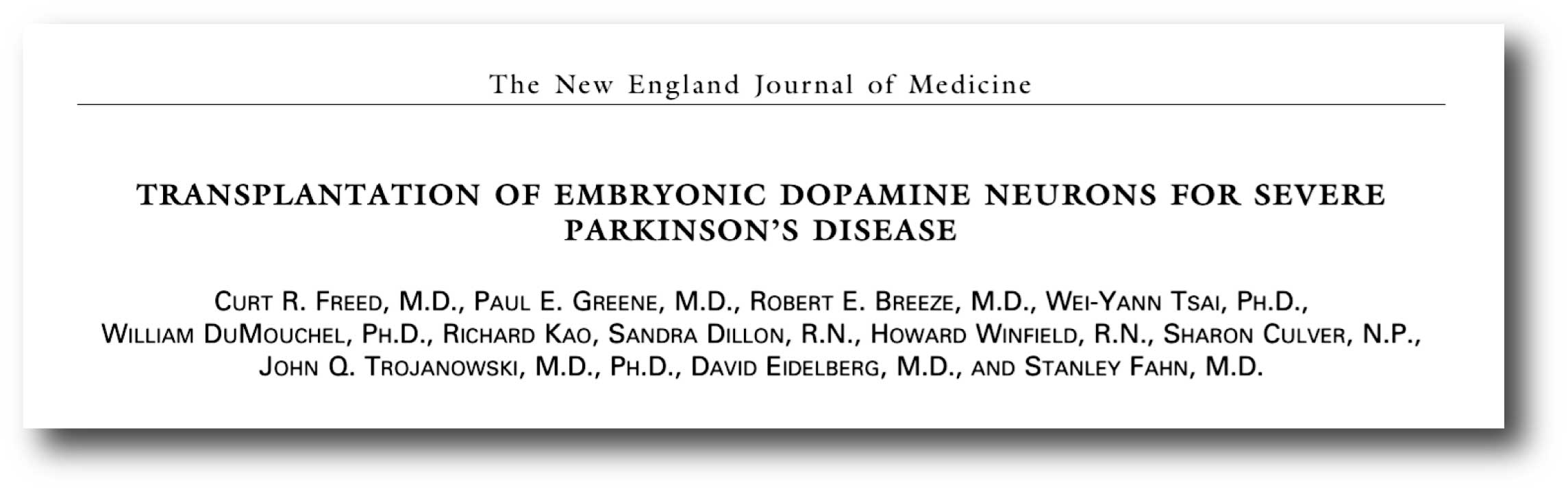 Authors: Freed CR, Greene PE, Breeze RE, Tsai WY, DuMouchel W, Kao R, Dillon S, Winfield H, Culver S, Trojanowski JQ, Eidelberg D, Fahn S.