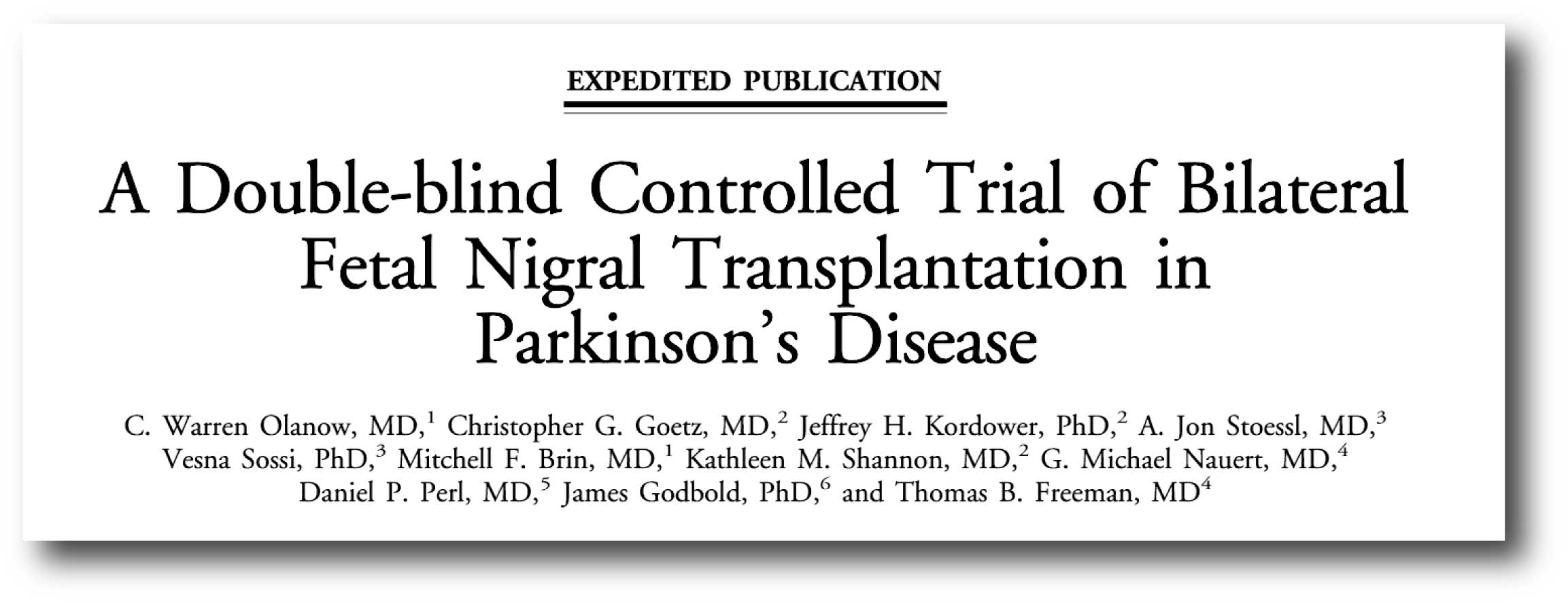 Authors: Olanow CW, Goetz CG, Kordower JH, Stoessl AJ, Sossi V, Brin MF, Shannon KM, Nauert GM, Perl DP, Godbold J, Freeman TB.
