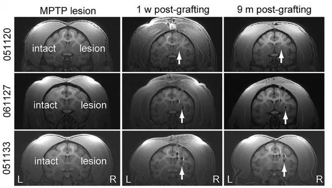 The labelled the cells with nanoparticles (to help identify the neurons) and they transplanted the cells into a primate model of Parkinson’s. 10 primates had been injected with a neurotoxin (MPTP) and behaviourally tested for 11 months. They were then divided into 3 groups (Control, Protocol #1 and Protocol #2). The control animals (3 of them) received no transplant, while the rest of the animals received cells made using either protocol #1 or protocol #2 (4 & 3 animals in each group, respectively). A total of 2 million cells were injected into both ends of the striatum (the region where the chemical dopamine is usually released – the putamen and the caudate) on the left side of the brain in each of the animals given a transplant. Brain scans immediately after surgery confirmed that the cells were placed correctly (you can see in the image below white arrows indicating the location of transplanted cells in three primates (#051120 was a control).