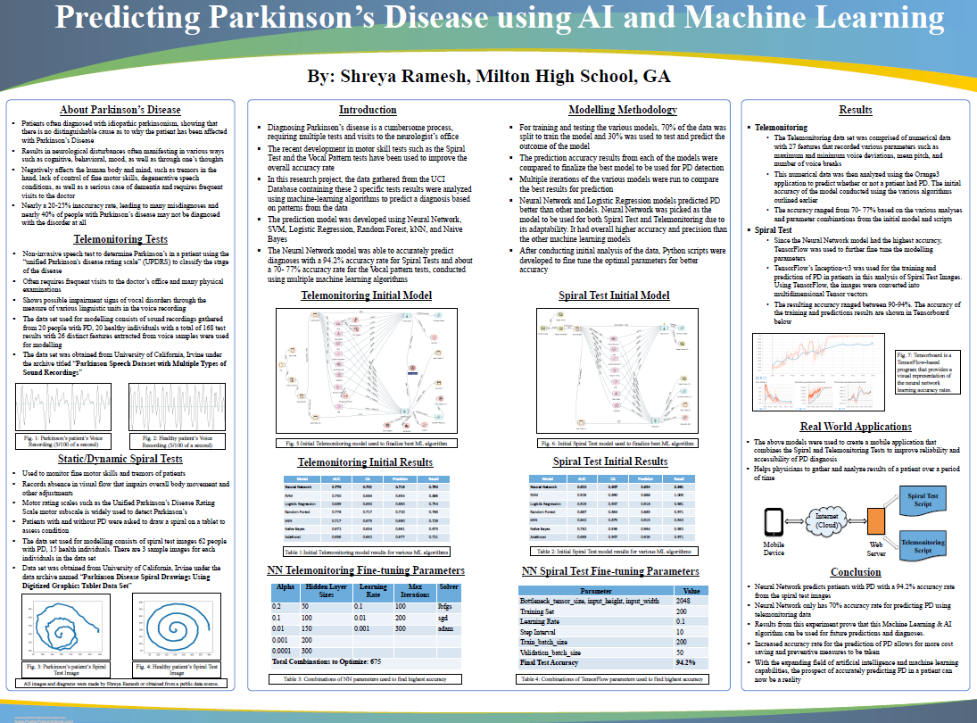 So Shreya decided she would apply machine learning to help with the early detection of Parkinson’s.