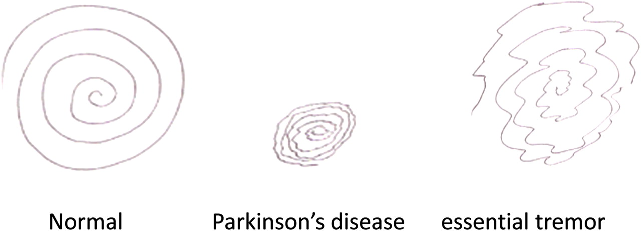 The spiral test involves individuals drawing an inwardly turning spiral (this test has recently been proposed by Australian researchers to be a very useful determinant of Parkinson’s – Click here to read more about that study). People with Parkinson’s usually draw a smaller spiral than controls (and people with essential tremor – a different kind of Parkinsonism) – as displayed in the image below: