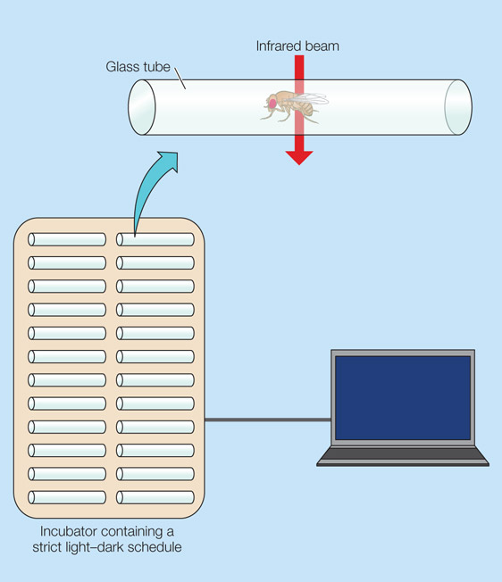 And these tubes are kept in an incubator on a strict light/dark schedule. Periods of inactivity (sleep) can be measured across a period of 24 hours.