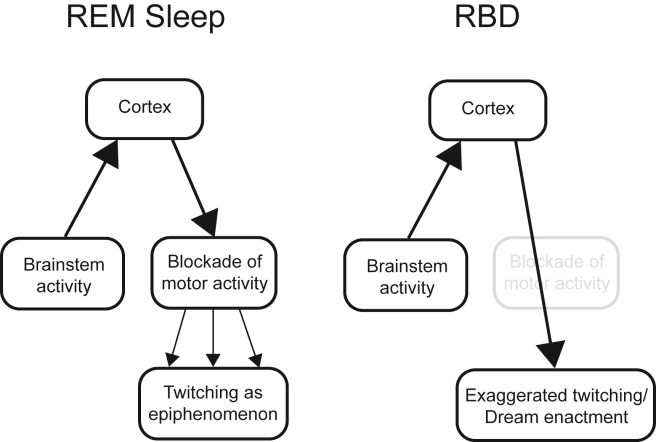 The exact cause of RBD is unknown, but the condition is association with various degenerative neurological conditions, such as Parkinson’s, Multiple System Atrophy, and Lewy body dementia. This association has given rise to the theory that RBD may result from the death of neurons in the brain stem that help to control the body during sleep. These cells normally prevent the body from physically responding to the events in dreams, but in their absence there is nothing stopping the body from reacting.