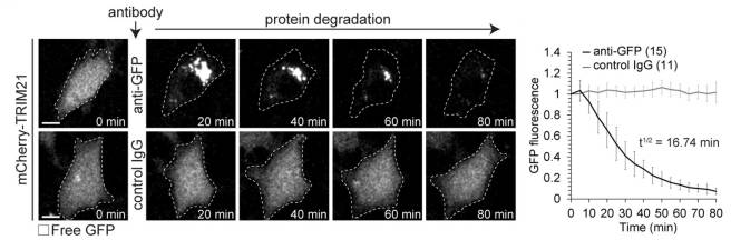 In this study, the researchers produced cells that generate huge amounts of TRIM21. They found that very high levels of TRIM21 did not affect the overall well being of the cells. The investigators then introduced a green fluorescent protein (or GFP) to those cells, which floated around inside them. Next, they exposed the cells to antibodies that targeted GFP and they observed a rapid disposal of GFP over the space of approximately 1 hour.