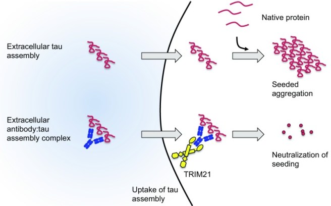 In this study, the Cambridge exposed human cells grown in cell culture to aggregated TAU (with antibodies attached), and they found that TRIM21 could intercept and potently neutralise the antibody-labeled TAU. In the absence of TRIM21, TAU protein (with antibodies attached) would simply aggregate.