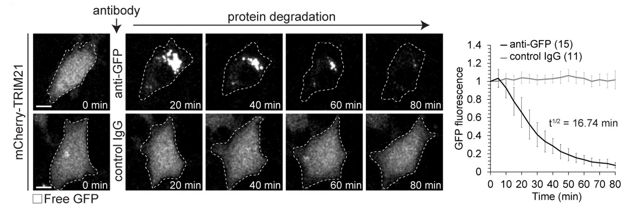 In this study, the researchers produced cells that generate huge amounts of TRIM21. They found that very high levels of TRIM21 did not affect the overall well being of the cells. The investigators then introduced a green fluorescent protein (or GFP) to those cells, which floated around inside them. Next, they exposed the cells to antibodies that targeted GFP and they observed a rapid disposal of GFP over the space of approximately 1 hour.
