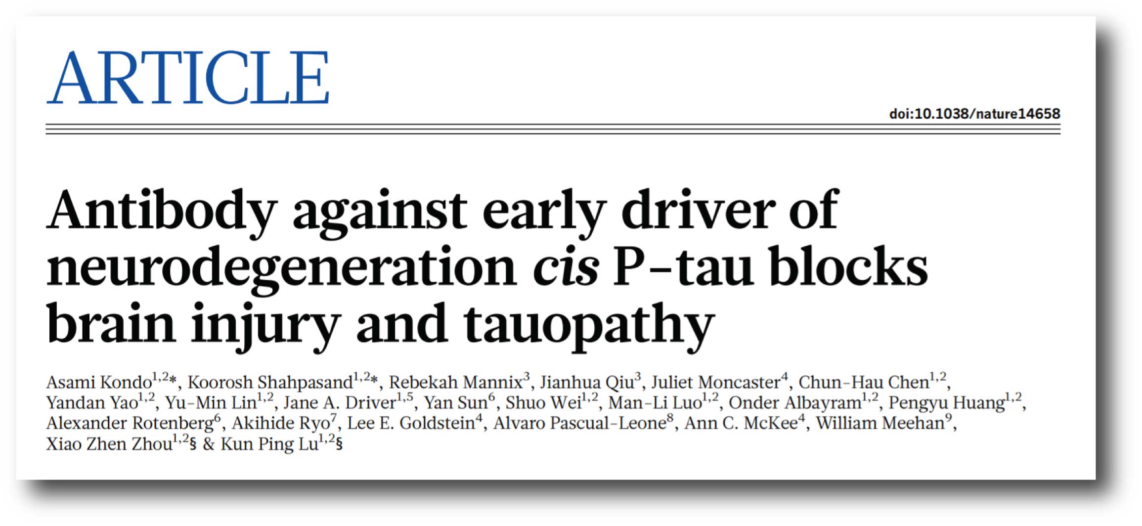 Authors: Kondo A, Shahpasand K, Mannix R, Qiu J, Moncaster J, Chen CH, Yao Y, Lin YM, Driver JA, Sun Y, Wei S, Luo ML, Albayram O, Huang P, Rotenberg A, Ryo A, Goldstein LE, Pascual-Leone A, McKee AC, Meehan W, Zhou XZ, Lu KP.