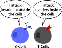 The most basic way to think of B-cells and T-cells is that B-cells take care of pathogens outside of cells, while T-cells deal with pathogens that have already infected cells.