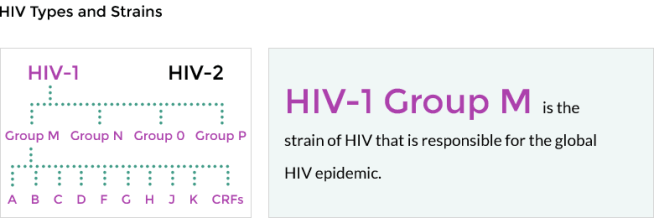 Two types of HIV have been characterised: HIV-1 and HIV-2. HIV-1 is the virus that was initially discovered, and it is is the cause of the majority of HIV infections worldwide. HIV-2 is less infectious and primarily focused in West Africa. These two subtypes of HIV can be further broken down into numerous subgrouping (Click here to read more about these). HIV-1 can be divided into 4 different groups of which Group M can be further subdivided. And there are 8 known HIV-2 groups (A to H).
