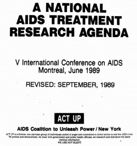 In addition, a well considered agenda backing the activism started to develop from the ACT UP meetings. For example, in June 1989, ACT UP activists presented their National AIDS Treatment Research Agenda outlining 12 issues where they wanted to see reform in AIDS-related research (if you haven’t read it, you should. It makes for interesting reading – demonstrating how far we have/haven’t come).