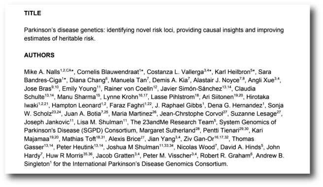 Authors: Nalls MA, et al (there were a lot of researchers involved in this study), Singleton AB, The 23andMe Research Team, System Genomics of Parkinson’s Disease (SGPD) Consortium, International Parkinson’s Disease Genomics Consortium