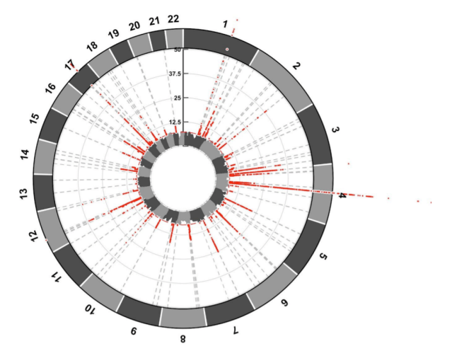 The risk factors were presented in an Iris plot, which is similar to a Manhattan plot except circular. The same principles apply with the red dots representing the chromosomal location of major genetic risk factors. For example, in the image below there are a lot of red dots over the 4th chromosome, which is where the alpha synuclein gene is located:
