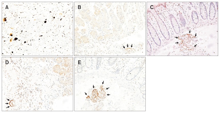 In the image above, the researchers presented a positive control of alpha synuclein in Lewy bodies in panel A (staining of postmortem brain tissue from a person who passed away with PD). Panel B is alpha synuclein in gastric tissue from a 78-year-old man with an 11-year history of PD. Panel C is alpha synuclein in gastric tissue from a 55-year-old woman with a 2-year history of PD. Panel D is is alpha synuclein in gastric tissue from a 67-year-old woman as a control. And panel E is alpha synuclein in gastric tissue from an 80-year-old man as a control.