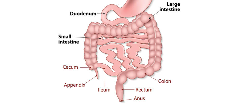 After the digestive process is started in your mouth and stomach, the broken down components of food is passed onto the intestines. The intestines are a long, continuous tube running from the stomach to the anus, which can be broken down into three regions:  the small intestine, large intestine, and rectum.