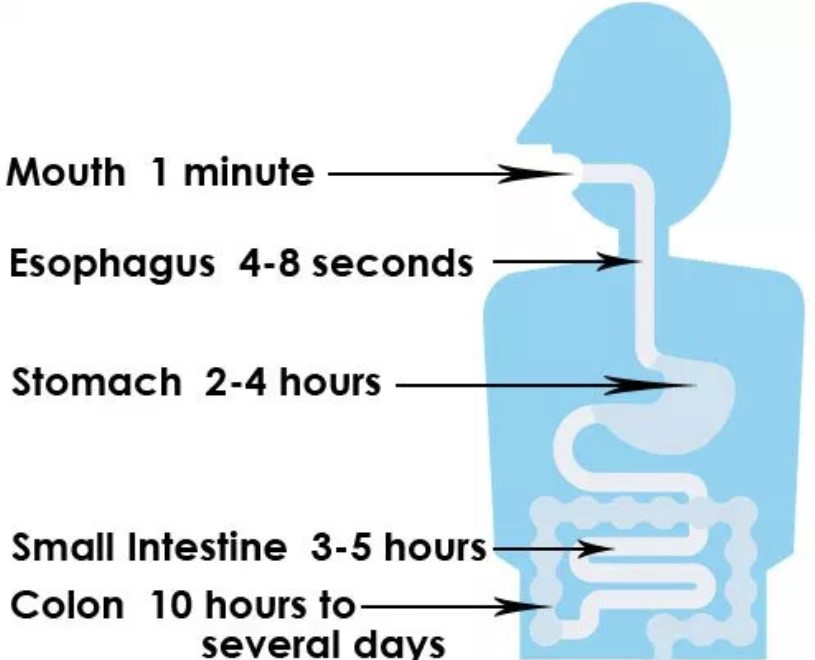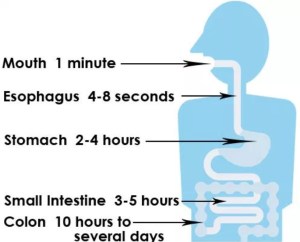 “Gut transit time” refers to how long it takes for the food that enters your mouth to be excreted as stool from your anus. This will take anywhere between 50-70 hours. The longest part of this process is  in the large intestine, where the average transit time is 40 hours (and there is significant difference between the sexes: 33 hours for men, 47 hours for women).