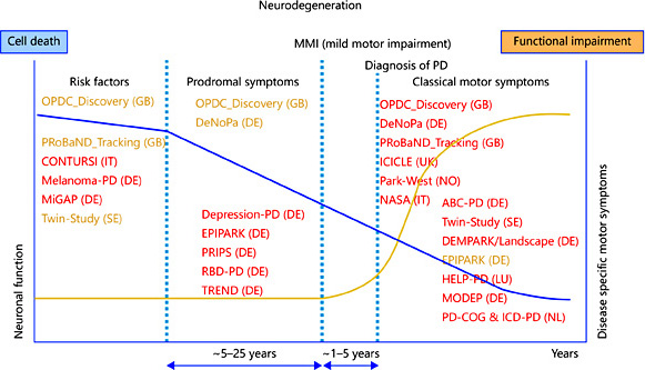Well, for a long time we have been collecting clinical and epidemiological information about the Parkinson’s community (a very nice review of this is available by clicking here). In the image below, you can see that we have collected clinical information from many different phases of Parkinson’s. The red and yellow text in the image lists the names of different studies that have collected this information at each stage of the condition (red text highlights the studies with the largest number of participants in each phase):