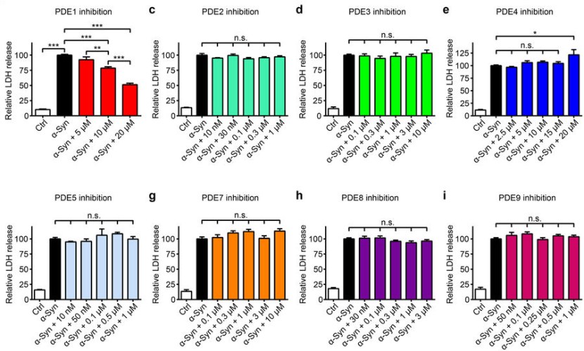 Only PDE1 inhibition (Vinpocetine) reduced alpha synuclein toxicity. Source: Nature