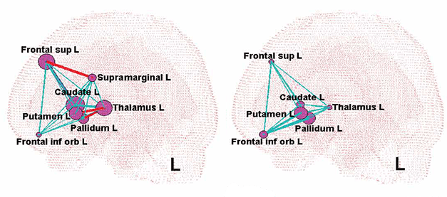 As the image below illustrates, when the researchers looked at differences in glucose activity in the brain, and then formed a metabolic network of the data, they found significant differences between the networks in the brains of the GAD-gene therapy treatment group and the control group.