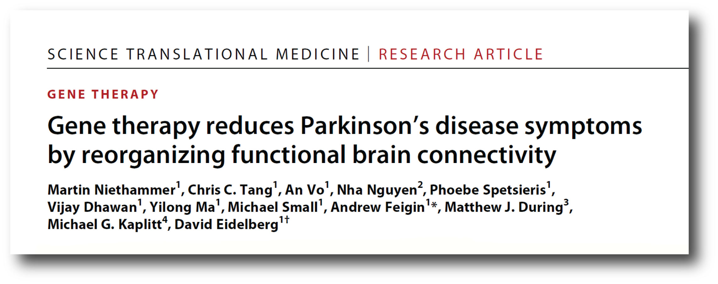 Authors: Niethammer M, Tang CC, Vo A, Nguyen N, Spetsieris P, Dhawan V, Ma Y, Small M, Feigin A, During MJ, Kaplitt MG, Eidelberg D.