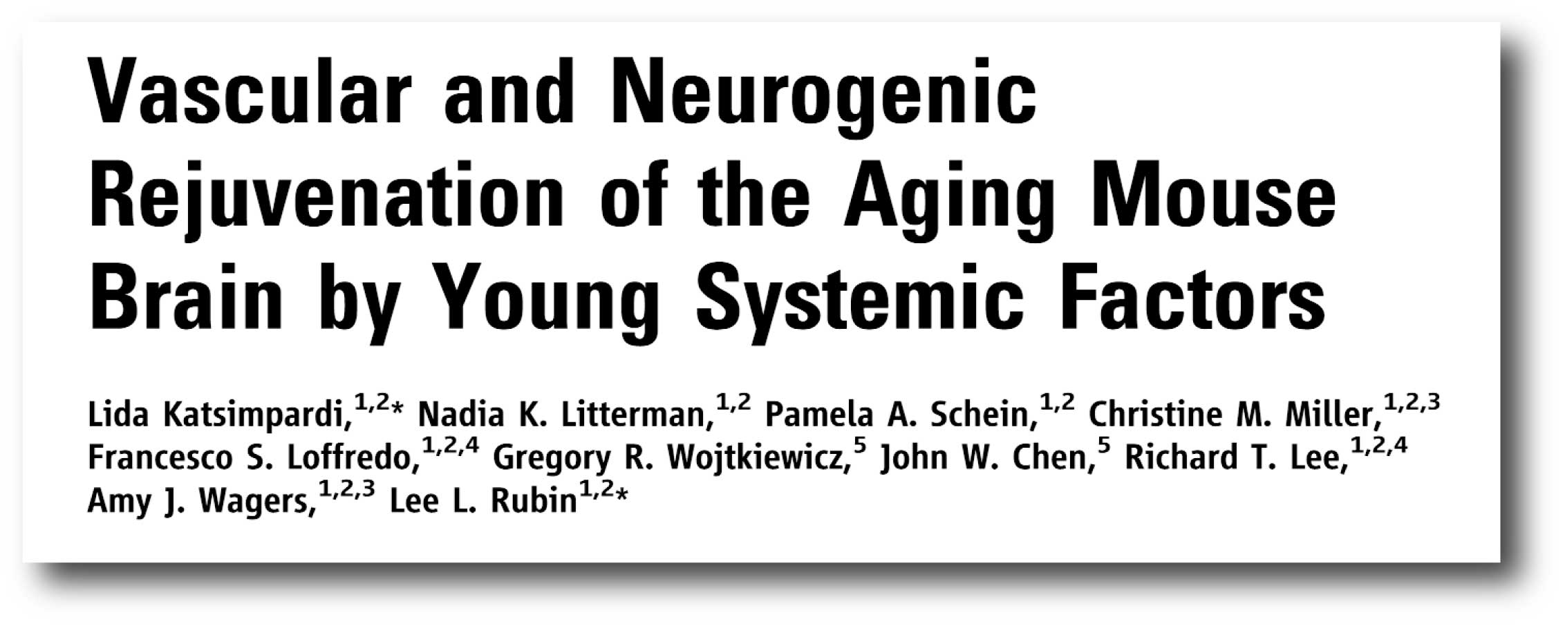 Authors: Villeda SA, Plambeck KE, Middeldorp J, Castellano JM, Mosher KI, Luo J, Smith LK, Bieri G, Lin K, Berdnik D, Wabl R, Udeochu J, Wheatley EG, Zou B, Simmons DA, Xie XS, Longo FM, Wyss-Coray T.