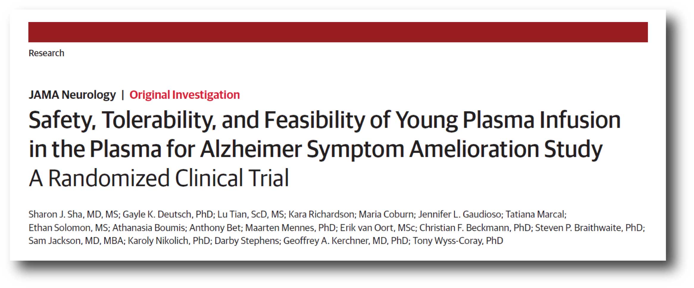 Title: Safety, Tolerability, and Feasibility of Young Plasma Infusion in the Plasma for Alzheimer Symptom Amelioration Study: A Randomized Clinical Trial.