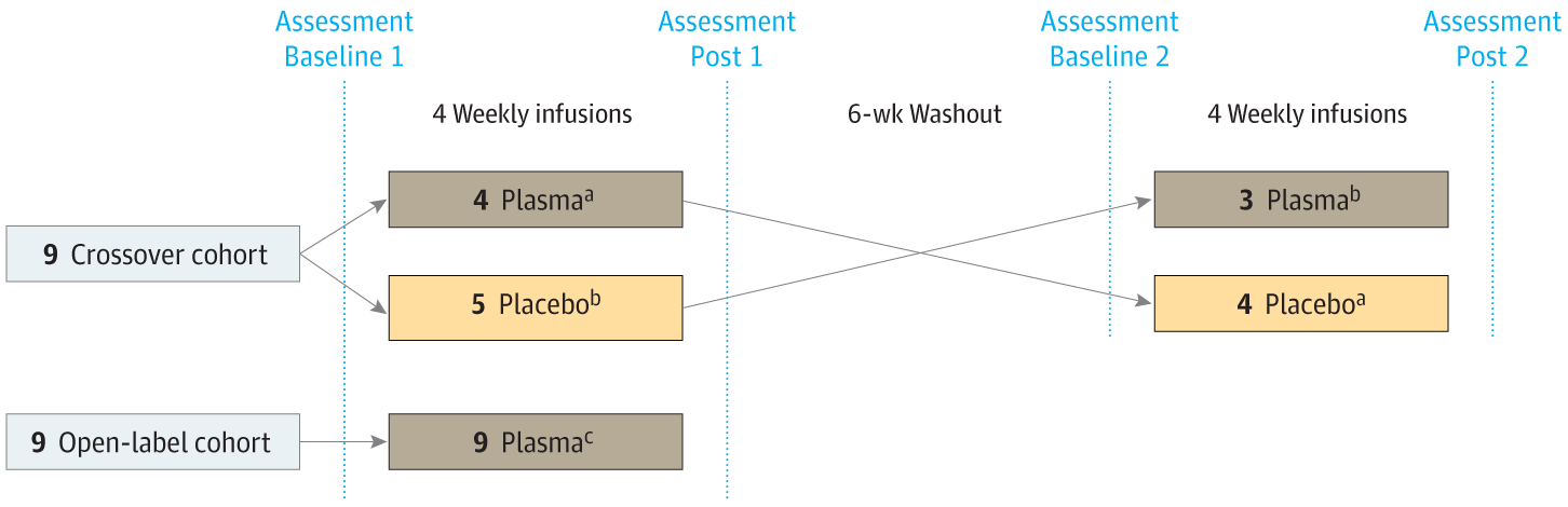 This was a 12-week study that involved a four-week treatment regimen of once-per-week injections of one unit of plasma (from males aged <30 years – Click here to read more about this). This treatment was compared to a placebo treatment, but there was a cross-over design incorporated in the study: