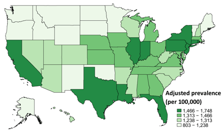 • According to 2014 Medicare beneficiaries data, the prevalance of Parkinson’s in the USA varies from 845/100,000 in Minnesota to 1781/100,000 in New York. Top 6: New York, Illinois, Connecticut, Florida, Pennsylvania, & Rhode Island ( to read more about this).