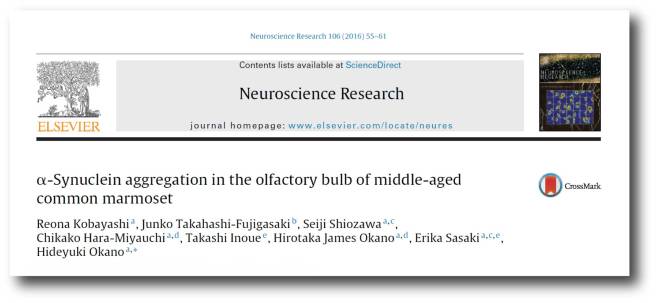 In this study, the researchers compared alpha synuclein levels in the brains of young (2-years-old) and middle-aged (6-years-old) common marmoset (Callithrix jacchus) primates. The results reported alpha synuclein aggregation were present in the olfactory bulb (the smell oriented part of the brain) in middle-aged animals, but not the young brains.