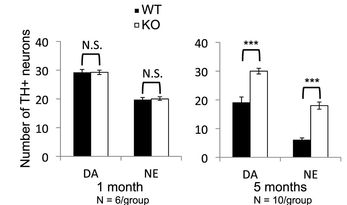 …but this genetic correction (and absence of alpha synuclein) did result in both the dopamine (DA) neurons and noradrenergic (NE) neurons surviving longer. There were significantly more DA and NE neurons at the 5 months of age stage. In the bar graphs below, note that the N. furzeri fish with no alpha synuclein (KO) have similar numbers of DA and NE neurons are 5 months (graphs on the right) to what they had at 1 month of age (graphs on the left).