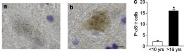 In this study, the researchers compared dopamine neurons in the substantia nigra of 4 young adult (<10yrs of age) vs 3 old (>16 yrs of age) squirrel monkeys. Their analysis suggested an increase in both normal and modified forms of alpha synuclein protein with aging. There were more dopamine neurons with high levels of alpha synuclein at the older time points.